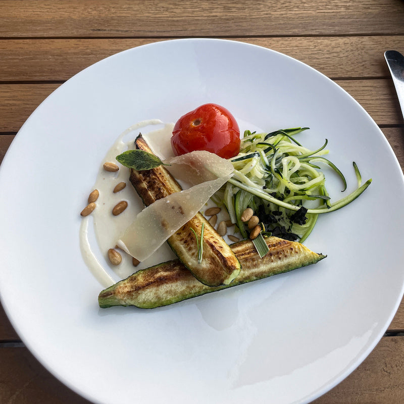 Die ersten drei Gänge vergingen wie im Flug, was auch am herzlichen Service lag, den wir am Tisch erfahren durften. Dann folgte ein Gang, der Zucchini in den Vordergrund stellte. Ein Gemüse, das man eher nicht mit außergewöhnlichen Geschmackserlebnissen in Verbindung bringt. Doch die Harmonie der Untermünkheimer Zucchini - gebraten und roh als Spaghetti - mit der Parmesancreme, den getrockneten Oliven, dem gehobelten Parmiggiano Reggiano und den hochintensiven Kräutern, war nicht weniger als ein wahrgewordener Sommertraum.