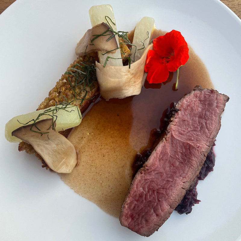 Engels Weidekalb, Kohlrabi, Grünkern, Sauce Marchand du Vin