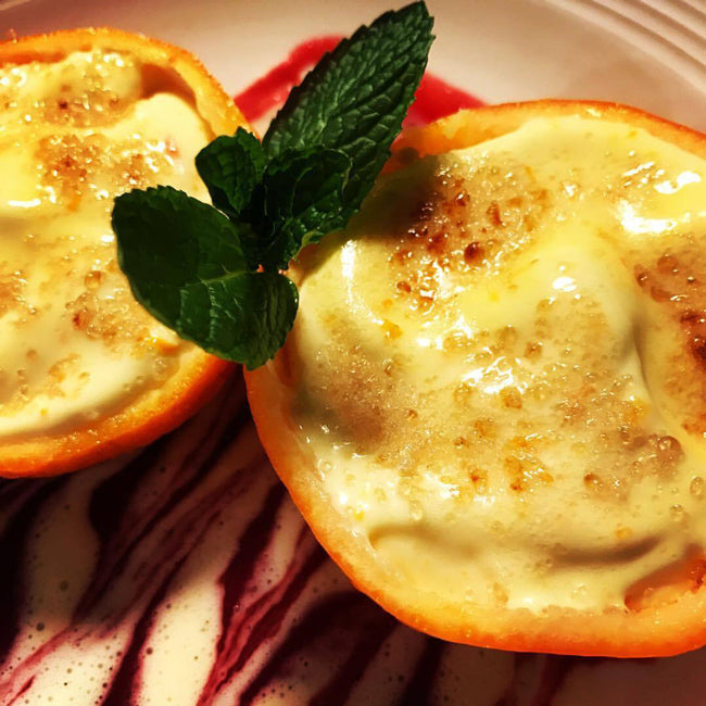 Vor dem Servieren, die gefrorenen Mandarinenhälften aus dem Gefrierfach nehmen und gleichmäßig mit brauen Zucker bestreuen und mit einem Bunsenbrenner karamellisieren.