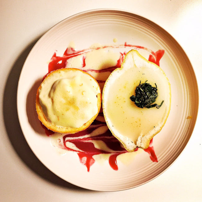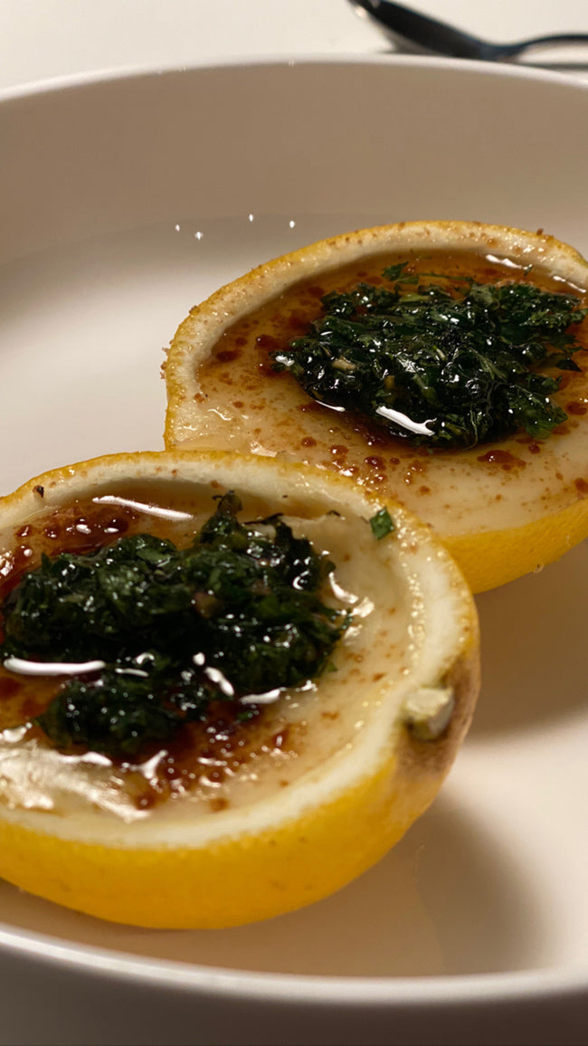 Nehme die gefüllten Zitronenhälften aus dem Kühlschrank und bestreue sie gleichmäßig mit brauen Zucker. Nun wird es heiß. Mit dem Bunsenbrenner (alternativ kurz unter dem heißen Backofen) goldbraun karamellisieren). Den Minze-Salat dazu servieren.